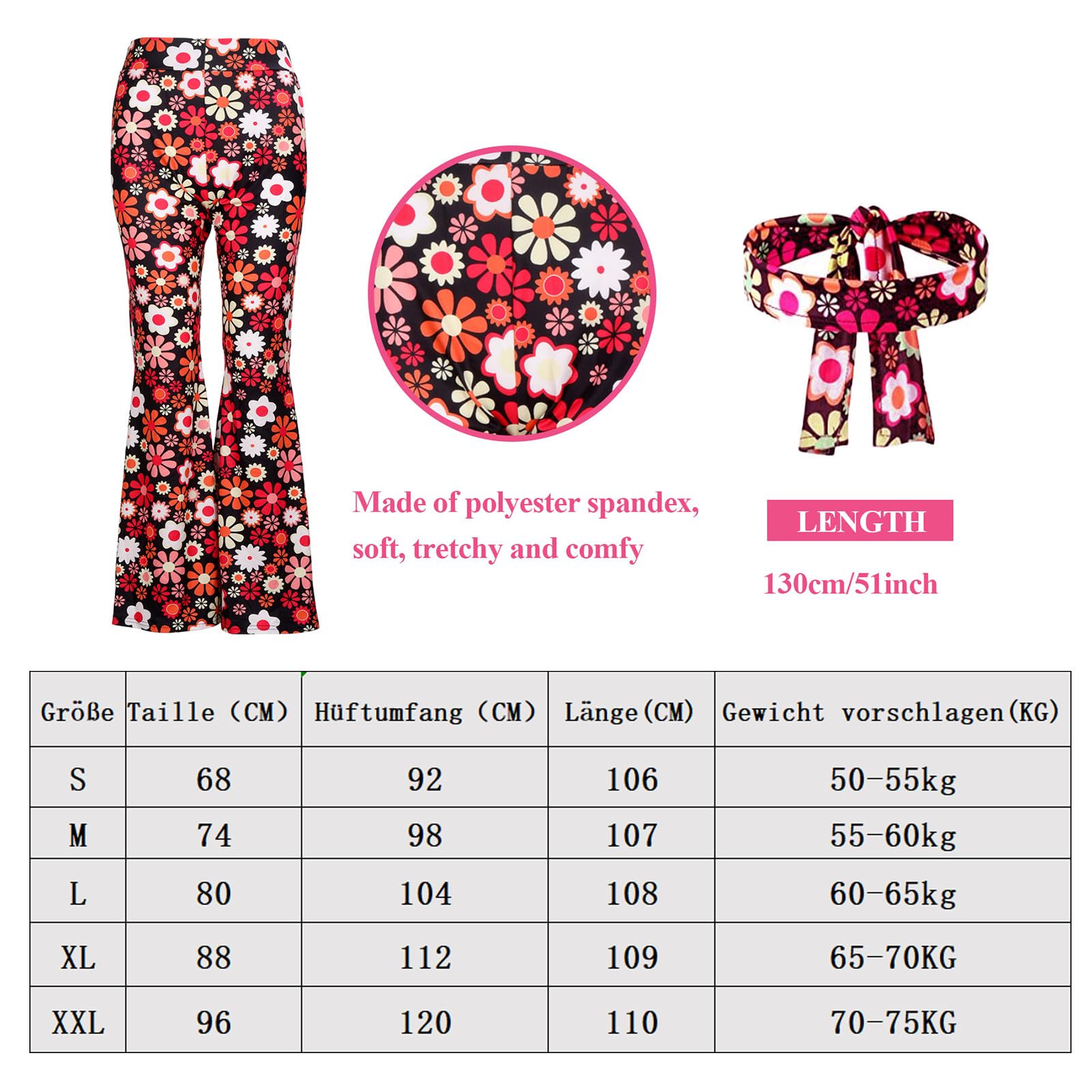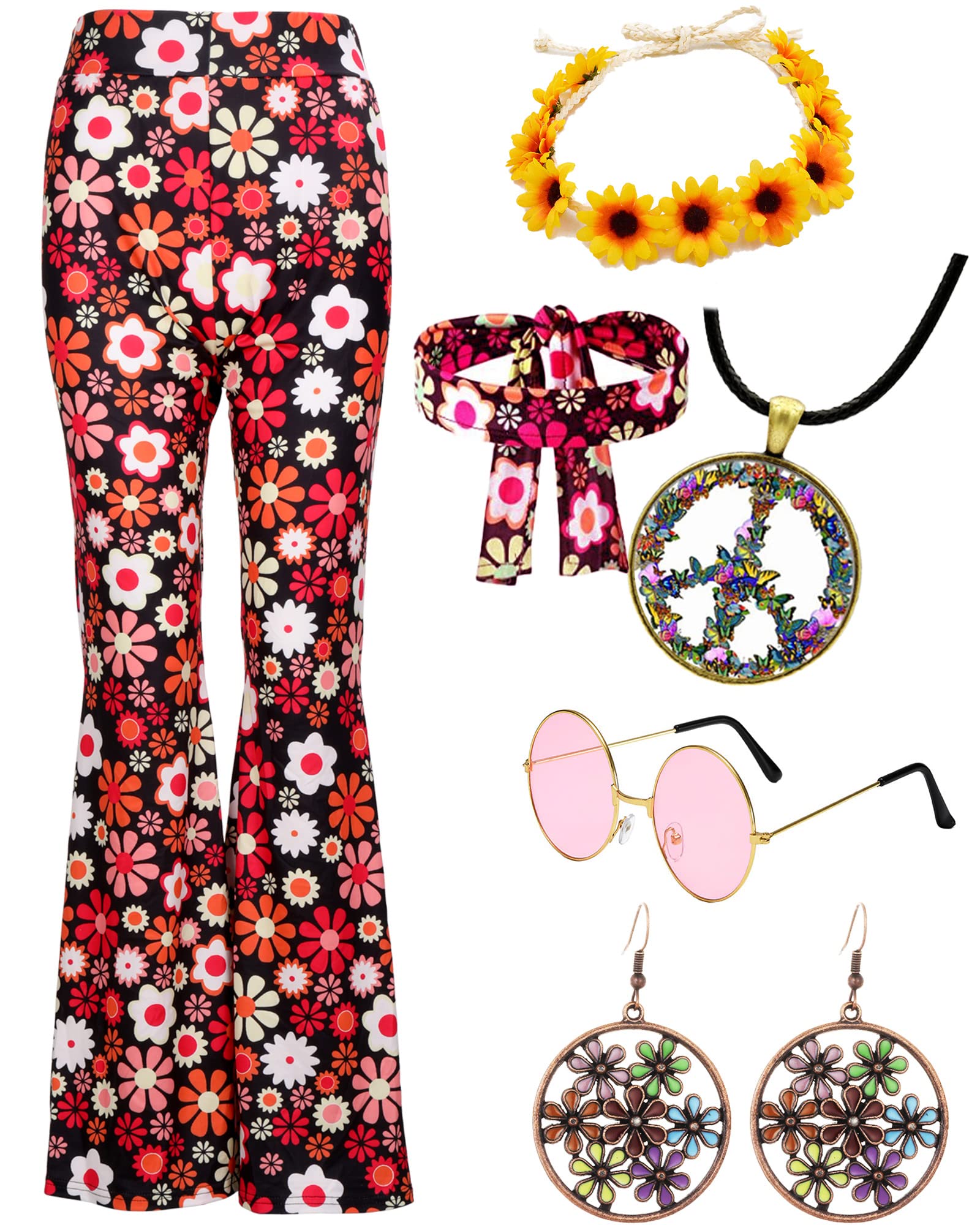 YADODO Costume hippie pour femme : pantalon évasé, lunettes, bandeau, années 60-70, taille XL
